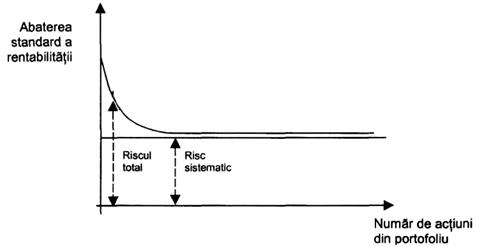 si unde Coeficientul de corelatie ia valori in intervalul -1, +1]. Valoarea +1 indica o relatie pozitiva, liniara intre R, si Rj (unei cresteri a rentabilitatii titlului i' ii corespunde o crestere, in aceeasi masura, a rentabilitatii celui de-al doilea titlu j'), iar -1 exprima o relatie negativa (cresterea rentabilitatii titlului i' este insotita de o scadere, in egala masura, a rentabilitatii titlului complementar j'). Valoarea zero indica faptul ca rentabilitatile nu sunt corelate din punct de vedere statistic, ci variaza in timp total independent. Absenta vreunei corelatii face ca riscul portofoliului sa se diminueze. in general, corelatiile negative sunt foarte rare pe piata financiara; cele mai multe sunt corelatii slab pozitive. Daca coeficientul de corelatie este egal cu 1 atunci se atinge cel mai mare risc al portofoliului, daca 0<Pij<0,5, situatie frecvent intalnita pe piata de capital, atunci riscul portofoliului se amelioreaza semnificativ, investitorul fiind motivat sa aplice diferite strategii active si pasive de gestiune a portofoliului. Pe baza corelatiilor dintre rentabilitatile a doua titluri, investitorul va cauta combinatia optima intre cele doua titluri, care sa conduca la cel mai mic risc pe unitatea de rentabilitate. Varianta portofoliului este mai mica decat varianta medie a doua actiuni. in consecinta riscul care poate fi eliminat prin diversificare este numit risc unic sau nesistematic sau rezidual sau diversificabil. Acesta este legat in mod unic de un activ sau de o firma. Exista si riscuri care nu pot fi evitate, in functie de cat de diversificat este portofoliul. Acest risc se numeste riscul pietei sau risc sistematic sau risc nediversificabil si reprezinta variatia rentabilitatilor pentru toate activele cu risc cauzata de variabile macroeconomice. Riscul sistematic este masurat de abaterea standard a rentabilitatii portofoliului pietei si depinde de modificarea variabilelor macroeconomice cum ar fi: volatilitatea ratei dobanzii, variatii ale masei monetare, fluxuri de numerar, modificari majore in sectorul productiv etc. Riscul unui portofoliu depinde de trei factori: riscul fiecarei actiuni incluse in portofoliu, numarul de titluri din portofoliu si gradul de dependenta a variatiilor rentabilitatilor individuale intre ele, ramura economica Urmarind corelatia dintre rentabilitatea si riscul portofoliului pe masura ce creste succesiv ponderea Wj a titlului i', se poate construi curba investitiilor de capital cu randamente descrescatoare pornind de la portofoliul optim si ajungand la portofoliul marginal care nu mai aduce nici un plus de rentabilitate la o unitate de risc asumata suplimentar. Stancu I., Huidumac C, Teoria portooliilor (cu aplicatii pe piata financiara Totalitatea portofoliilor cuprinse intre portofoliul cu varianta minima definit ca portofoliu optim si portofoliul marginal sunt portofolii eficiente, care ofera maximum de rentabilitate la un risc asumat in mod deliberat. Rata rentabilitatii estimate a unui portofoliu cu n' titluri este direct proportionala cu rentabilitatile titlurilor componente si cu ponderea de participare a fiecarui titlu la compunerea portofoliului. Formula de calcul este: