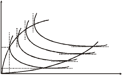Fig. 6.8. Izocuante convexe Convexitatea izocuantelor se poate explica si altfel . Pentru aceasta se presupune ca forma izocuantelor ar fi cea din Fig. 6.9., in care ele prezinta si inclinatii pozitive. Liniile punctate din aceasta reprezentare grafica (care sunt paralele fie cu axa absciselor, fie cu axa ordonatelor) marcheaza punctele in care izocuantele isi schimba inclinatiile (pantele) din pozitive in negative (sau invers). Daca se intentioneaza, de pilda, sa se obtina o