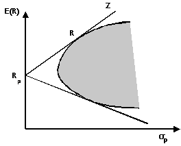 In conditiile in care investitorii au alternativa investitionala in active cu risc conform modelului Markowitz, vor investi in portofolii aflate pe frontiera de eficienta Markowitz. Daca insa au in vedere si investitia in activul fara risc ei vor constitui un portofoliu ca cel analizat anterior. Dar analizand intersectia acestei drepte cu frontiera de eficienta Markowitz vom obtine situatiile din figura II-18. Investitorii pusi in fata situatiei din aceasta figura vor alege dreapta care este tangenta frontierei eficiente Markowitz in punctul G, pentru ca pentru acelasi risc ca in situatiile A sau B ofera o rentabilitate estimata mai mare. Portofoliul G este plasat in punctul in care dreapta care defineste portofoliul mixt activ cu risc activ fara risc este tangenta frontierei de eficienta Markowitz. Astfel in situatia in care investitorii aleg investitia in active cu risc vor investi intr-un portofoliu G care este din aceasta cauza denumit portofoliu optim. Daca nu exista posibilitatea de imprumut, investitia va fi plasata pe portiunea RFRG a dreptei, iar daca exista atat posibilitatea de depozitare cat si de imprumut, portofoliul investitorului va