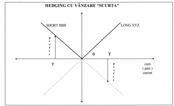 Figura 7.3: Profitul operatorului cu o pozitie short selling Sursa : Popa, I - Bursa, vol II, Colectia Bursa, Bucuresti 1994, p.38. Vanzarile scurte in scop de acoperire a riscurilor. Vanzarile short pot fi facute si in vederea acoperirii riscurilor (engl. hedging) de catre investitorul care nu detine titlurile respective, dar se teme de o scadere generala a pietei care sa afecteze valoarea de piata a actiunilor din portofoliu, altele decat cele pe care se face vanzarea scurta. Daca piata scade, valoarea portofoliului sau de titluri (MV) se va reduce; dar, la acoperirea pentru vanzarile short facute in scop de hedging, operatorul va obtine un profit care ii va compensa pierderea de valoare a titlurilor pe care le detine. Cele de mai sus se pot ilustra grafic. Figura 7.4 prezinta cazul unui operator care are, simultan, doua pozitii diferite: una long pe actiunile XYZ (detine in portofoliu aceste actiuni) si alta short pe actiunile BBB (face o vanzare scurta cu actiunile respective). Daca piata scade, adica ambele actiuni vor inregistra pierderi de curs, pierderea pe care o sufera intregul portofoliu va fi compensata de castigul la pozitia short[2].