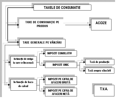 Figura nr. 9.1. In practica fiscala se intalnesc doua mari tehnici de impunere a cheltuielilor de consum: a. prin impozite analitice pe anumite cheltuieli specifice, rezultand taxe de consumatie pe produs (accize); b. printr-un impozit sintetic pe cheltuiala globala care afecteaza ansamblul cheltuielilor efectuate de un contribuabil, rezultand taxe de consumatie cu caracter general (taxe generale pe vanzari). Taxele de consumatie pe produs (accizele) Aceste taxe vizeaza consumul anumitor produse care se consuma in cantitati mari si care nu pot fi inlocuite de cumparatori cu altele, pentru ca in acest fel, impozitul sa aiba un randament fiscal cat mai ridicat. Instituirea de impozite pe anumite cheltuieli specifice de consum ridica, pe de o parte, o problema de politica fiscala constand in alegerea categoriilor de bunuri care sa fie impozitate, iar pe de alta parte, o problema de tehnica fiscala, ce consta in alegerea metodelor de impozitare. In legatura cu primul aspect, in prezent, aceste impozite vizeaza doua mari categorii de marfuri: articolele de lux (blanuri naturale, bijuterii, articole de cristal, autoturisme, arme de vanatoare etc.) si unele bunuri de uz curent consumate in cantitati mari si care au cerere inelastica (bauturi alcoolice, produse din tutun, cafea, produse petroliere etc.).