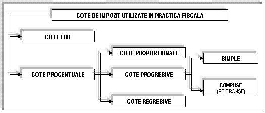 Figura nr. 7.4. a. Impunerea in cote (sume) fixe nu tine seama de venitul sau averea contribuabilului si nici de situatia personala a acestuia. Ea a aparut sub forma unei dari pe locuitor si s-a utilizat in oranduirea feudala si in primele stadii de dezvoltare a capitalismului, in special. b. Impunerea in cote procentuale poate fi intalnita sub forma impunerii in cote proportionale, in cote progresive si in cote regresive. 1. Impunerea in cote proportionale este o manifestare directa a principiului egalitatii in fata impozitelor. Conform acestei impuneri se aplica aceeasi cota de impozit indiferent de marimea obiectului impozabil, pastrandu-se in permanenta aceeasi proportie intre impozit si volumul venitului (valoarea averii). Desi prin introducerea impunerii in cote proportionale s-a facut un pas inainte fata de impunerea in cote (sume) fixe, nici in acest caz nu s-a respectat echitatea in materie fiscala, pentru ca nu s-a avut in vedere faptul ca puterea contributiva a diferitelor categorii sociale este diferita in functie de marimea absoluta a veniturilor pe care le realizeaza si de valoarea absoluta a averii pe care o poseda. Impunerea in cote proportionale s-a utilizat pe scara larga la calculul impozitelor de tip real (funciar, pe cladiri, pe activitati industriale, comerciale si profesii libere etc.). In prezent, impunerea in cote proportionale se foloseste atat in cazul impozitelor directe (de exemplu, in unele tari pentru calculul impozitului pe profitul societatilor de capital), cat si in cazul impozitelor indirecte (de exemplu, la taxa pe valoarea adaugata, la taxele vamale, la taxele de timbru etc.). 2. Impunerea in cote progresive s-a introdus, in unele tari, in a doua jumatate a secolului al XIX-lea, iar in altele (de fapt acestea reprezinta majoritatea) la inceputul secolului al XX-lea. Impunerea progresiva consta in aceea ca odata cu cresterea venitului (averii) are loc si cresterea cotei impozitului astfel incat impozitul creste mai repede decat obiectul impozabil. Cotele progresiei pot creste fie intr-un ritm constant, fie intr-unul variabil. Impunerea progresiva cunoaste in practica financiara doua variante si anume: impunerea in cote progresive simple (globale) impunerea in cote progresive compuse (pe transe). Impunerea in cote progresive simple (globale) se caracterizeaza prin faptul ca se aplica aceeasi cota de impozit asupra intregii materii impozabile apartinand unui contribuabil. Fiind vorba de o impunere progresiva, cota de impozit va fi cu atat mai mare, in limitele progresivitatii stabilite prin lege, cu cat venitul sau averea respectiva va fi mai mare. Impozitul datorat statului se obtine facand produsul dintre marimea obiectului impozabil (venitul, averea) si cota de impozit aferenta nivelului acestuia Impunerea in cote progresive simple, desi a condus la o apropiere importanta de ceea ce insemna respectarea echitatii in domeniul impozitelor, are totusi unele neajunsuri. Aceasta modalitate de impunere dezavantajeaza pe contribuabilii care realizeaza venituri al caror nivel se situeaza la limita imediat superioara celei pana la care actioneaza o anumita cota. Impunerea in cote progresive compuse (pe transe) are ca trasatura distinctiva divizarea materiei impozabile in mai multe transe (parti), iar pentru fiecare transa de venit (avere) se stabileste o anumita cota de impunere. Prin insumarea impozitelor partiale calculate pentru fiecare transa de venit (avere) in parte se obtine impozitul total de plata ce cade in sarcina unui contribuabil. Impunerea in cote progresive compuse (pe transe) este folosita mai mult pentru impunerea veniturilor obtinute de persoanele fizice si uneori si la unele impozite pe avere. 3. In practica fiscala a unor state se intalneste si impunerea in cote regresive, ca o consecinta a impozitelor indirecte, in situatia cumpararii unei marfi sau a utilizarii unui serviciu cand impozitul platit este acelasi, indiferent de marimea veniturilor cumparatorului. Aceasta face ca ponderea impozitului in venitul cumparatorului sa fie invers proportionala cu venitul acestuia.