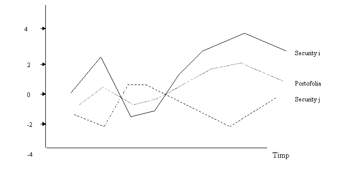 Aceasta distributie reflecta probabilitatile ca titlul sa ofere anumite castiguri intr-o perioada determinata de timp. in mod normal, probabilitatile trebuie sa se rezume la una. Desi castigul asteptat al unui portofoliu este suma ponderata a castigurilor asteptate ale valorilor mobiliare componente, dispersia unui portofoliu nu este calculata ca suma ponderata a dispersiilor valorilor mobiliare componente. Desigur, dispersia fiecarei valori mobiliare se constituie intr-un factor de influenta, dar este necesara cunoasterea interdependentelor existente intre oscilatiile castigurilor prognozate ale valorilor mobiliare componente. Prin urmatoarele exemple se va demonstra logic veridicitatea celor expuse. Toate aceste exemple se refera la portofolii care includ doar doua valori mobiliare, dar principiile sunt valabile si pentru acele portofolii care includ mai mult de doua valori mobiliare. Totodata, pentru simplificarea explicatiei se va presupune ca valorile mobiliare din portofoliu nu sunt purtatoare de dividende sau dobanzi. De aceea, oscilatiile preturilor valorilor mobiliare sunt determinate numai de castigurile prognozate. Prin urmare, graficele se refera la oscilatiile in timp ale preturilor. In primul exemplu, evolutia celor doua valori mobiliare este identica. Cu toate ca amplitudinile oscilatiilor preturilor sunt diferite, schimbarile pretului sunt perfect corelate, ceea ce inseamna ca se poate determina cu maxima precizie oscilatia pretului unei valori mobiliare pe baza cunoasterii oscilatiei pretului celeilalte valori mobiliare. In acest exemplu, corelatia este pozitiva (cand pretul valorii mobiliare i creste sau scade cu 1%, pretul valorii mobiliare j creste sau scade cu 0,5%). Daca se presupune ca in cele doua valori s-a investit initial aceeasi suma, valoarea intregului portofoliul creste sau scade cu 0,75%. Pe baza formulei dispersiei, rezulta ca dispersia portofoliului este de 3,1%, dispersia valorii mobiliare i este 5,5%, iar cea a valorii mobiliare este 1,4%. In figurile II.2, II.3, II.4 pe orizontala este reprezentat timpul, iar pe verticala modificarea pretului. Figura II.2 Schimbarile procentuale ale preturilor valorilor mobiliare i si j(corelatia = 1,0) Schimbari in pret (%)