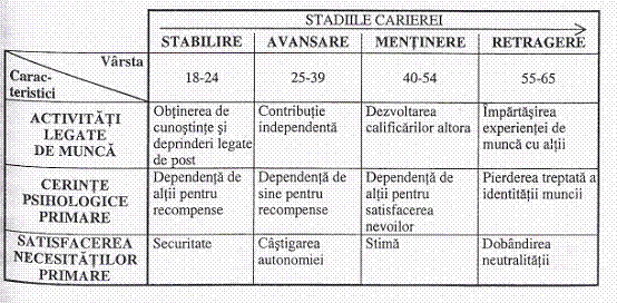 Fig.43 Stadiile carierei dupa L.A.Klatt si colab. Unele din caracteristicile importante ale stadiilor carierei, intr-un model cu patru niveluri (stabilire, avansare, mentinere si retragere) sun prezentate in fig.44