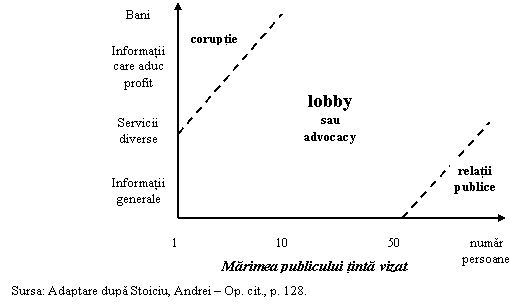 Figura nr. 18.1. prezinta diferentele dintre coruptie, lobby, advocacy si relatii publice, din perspectiva unei firme de comunicatii, angajata de un grup de interese sa pledeze o anumita cauza. Daca, de exemplu, pentru prevederea in bugetul statului a unei anumite sume de bani pentru infiintarea unei universitati de stat intr-o anumita localitate, firma in cauza va distribui brosuri parintilor elevilor de liceu din localitatea respectiva, cerandu-le sa le scrie parlamentarilor din circumscriptia in cauza, pentru a le solicita sprijinul in aceasta initiativa, ea va desfasura o activitate de relatii publice. Daca va trimite un memoriu justificativ fiecarui parlamentar din comisia pentru educatie, sugerandu-i ca preocuparea pentru rezolvarea acestei probleme ii poate aduce voturi la urmatoarele alegeri, sau daca va organiza o serie de seminare sau conferinte mediatizate corespunzator, cu participarea parlamentarilor implicati in luarea deciziei, pentru a discuta importanta infiintarii unei universitati, firma va apela la tehnici de lobby. In fine, daca va oferi sume de bani membrilor comisiei in cauza pentru finantarea campaniei electorale, firma se face vinovata de coruptie. 18.4. Utilizarea legala si eficienta a resurselor financiare Odata colectate fondurile necesare desfasurarii activitatii organizatiei sociale sau politice, se pune problema utilizarii acestora, astfel incat, pe de o parte, sa se obtina cele mai bune rezultate, iar, pe de alta parte, sa nu se incalce prevederile legale, acolo unde acestea exista. Venind din zona economicului, marketingul induce un nou comportament in cadrul organizatiilor sociale si al partidelor politice. Multa vreme, persoanele implicate in activitati sociale sau politice - si, ne referim aici la tarile occidentale - au privit cu detasare sau chiar cu superioritate aspectele financiare, inclusiv eficienta cheltuirii fondurilor disponibile. Banii erau considerati un aspect secundar, chiar murdar, in comparatie cu inaltele idealuri si cauze pe care organizatia respectiva era chemata sa le propavaduiasca. Aceasta atitudine, considerata de "bon ton" in anumite cercuri mai poate fi intalnita si astazi, chiar daca nu putini sunt si cei care fac din organizatii sociale sau din activitatea politica o adevarata afacere. Pentru o organizatie sociala, utilizarea unei conceptii de marketing presupune grija constanta de a utiliza fondurile disponibile in mod optim, adica, obtinand maximum de rezultate in indeplinirea obiectivelor sale. Desigur, problema eficientei nu se pune in aceiasi termeni in cazul unei organizatii sociale ca si in cazul unei organizatii lucrative. Eficienta sociala primeaza in fata eficientei economice. Dar, chiar in conditiile in care indicatorii de eficienta sociala sunt mai greu de identificat si de calculat, iar legatura cauzala dintre fondurile alocate unei activitati sociale si rezultatele obtinute poate fi mai putin evidenta decat in cazul unei activitati economice, este necesar sa se asigure un echilibru intre sumele cheltuite si rezultatele obtinute. Spre deosebire de alte abordari manageriale ale activitatii organizatiilor sociale, marketingul social presupune evidentierea costurilor si beneficiilor sociale si economice la nivelul diferitilor actori implicati: organizatie sociala, grup tinta, subscriptori, voluntari etc. In marketingul electoral, sumele de bani vehiculate cu ocazia alegerilor sunt din ce in ce mai impresionante. Daca, in 1864, Abraham Lincoln n-a avut nevoie decat de 0,75 dolari pentru a fi reinvestit in functia de presedinte al Statelor Unite[9], la ultimele alegeri prezidentiale ale secolului al XX-lea, republicanul George W. Bush si democratul Al Gore au dispus de bugete de 93,3, respectiv, 52,5 milioane de dolari. Nici in Romania sumele nu sunt chiar modice. Se apreciaza ca la alegerile pentru postul de primar general al Capitalei, desfasurate in anul 2000, campania electorala a costat "intre cateva sute de dolari (pentru candidatul Nahorniac), cateva mii de dolari (Aureliu Leca, candidatul P.U.R.), cateva zeci de mii de dolari (Ioan Radu, candidat P.R.M.), cateva sute de mii de dolari (Sorin Oprescu, candidat PSDR), cateva milioane de dolari (Calin Catalin Chirita, candidat CDR)".[11] In anul electoral 2000, partidele politice romanesti au beneficiat de publicitate la televiziune, radio si in presa scrisa, estimata la 16.828.026 USD[12], mai putin decat s-a cheltuit pentru promovarea marcilor de telefonie mobila sau de detergenti, dar mai mult decat suma cheltuita pentru bere, bauturi racoritoare sau oricare alte produse alimentare sau nealimentare (firma Coca Cola, de exemplu, a cheltuit pentru aceste forme de publicitate 6.324.943 USD). Pentru un candidat sau un partid politic aflat in campanie electorala, este important nu doar sa dispuna de o suma mare de bani, dar, in egala masura, ca acesti bani sa fie disponibili la momentul potrivit. In literatura de specialitate sunt prezentate cazuri in care implementarea campaniei electorale a avut de suferit datorita faptului ca, de exemplu, trecandu-se printr-o perioada de aparenta penurie, cu o luna inainte de alegeri, au fost anulate diferite activitati promotionale programate sa se desfasoare in preajma alegerilor, fara a se tine seama de obiceiul alegatorilor de a contribui cu donatii la fondurile campaniei, cu 2-3 saptamani inainte de alegeri. Cand banii au venit, recumpararea spatiului publicitar s-a dovedit imposibila.[13] Tinerea unei riguroase evidente contabile a cheltuielilor electorale este, in egala masura, o obligatie prevazuta de lege si o modalitate de a controla indeplinirea activitatilor programate. Acest dublu rol al gestionarii atente a fondurilor este subliniat si de Michel Noir, care apreciaza ca "fara un buget prestabilit nu va putea exista control, iar fara control exista riscul de a face cheltuieli inadecvate, si, mai ales, nu va fi posibila respectarea reglementarilor financiare ale campaniei."[14] Importanta planificarii financiare, ca in