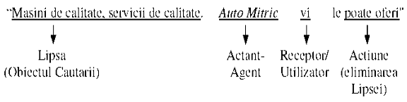 Dupa cum se observa, mesajele enuntiativ-narative angajeaza simultan cele trei elemente pronominale NOI - VOI - EI (ELE), cu adresabilitate explicita catre Destinatar/Receptor/Utilizator (VOI), atunci cand "vocea auctoriala" este Emitatorul mesajului (NOI, Ofertantul/Producatorul). Din punct de vedere logico-semiotic, evantaiul antropomorfic al actantilor este constituit in rema (comentariul), in timp ce Obiectul publicitar (al Cautarii) reprezinta tema (topicul, elementul central).