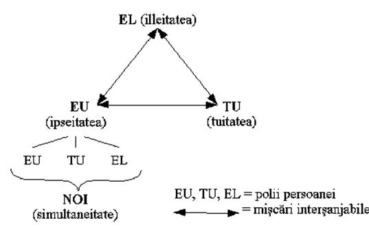 Din perspectiva elementelor individualizate EU/NOI - TU/VOI - EL/EI pe care, potrivit lui Charaudeau, se centreaza orice enunt sau dezvoltare discursiv-narativa, interesanta ni se pare conceptia triontica a persoanei , in care EU- l este comuniunea permanenta, simultana si dinamica a celor trei entitati EU - TU - EL care, la rigoare, nu inseamna persoane propriu-zise, ci "repere gnoseologice, exprimand functii si ipostaze de constiinta. Fara a se confunda cu pronumele personale, EU = ipseitate, TU = tuitate si EL = illeitate, de unde si un posibil model triontic al cunoasterii: "Ipseitatea (EU), guvernata de principiul necesitatii, reprezinta forma persoanei (.); tuitatea (TU) este o interactiune intre doua realitati aproximativ independente, guvernata de principiul posibilului si reprezinta structura psihismului, iar illeitatea (EL) include intamplarea, contingenta, hazardul si reprezinta sistemul persoanei. Aceste trei instante cognitiv-antropologice au functii intersanjabile si pot alterna reciproc una in locul celeilalte: EU implica pe TU care, impreuna, se pot referi la un EL exterior care, la randu-i, poate deveni TU (eventual EU) in context. Din interactiunea lor extinsa rezulta dialectica persoanei: